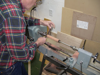 Lets start with the cork grip. I begin with cork rings that you see in post #4. These are placed on 1/4 inch all-thread with a layer of Weldwood Plastic Resin Glue between rings. Nuts are tightened down to compress the rings until glue is squeezed from all joints. This process has always resulted in a grip without viable joints between rings. The assembly is chucked into the lathe and turned to shape. My first step is to sand the grip round with 100 grit cloth on a wood block. This results in the cork being concentric around its axis. At this point I shape the grip using 100 through 600 cloth and paper. The grip is removed from the all-thread by holding the grip in one hand while spinning the shaft in reverse with a drill motor.