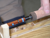 Devo turned two spigots so accurately that when fitted together without glue the rod sections could be assembled and whipped around like we all do when picking up a new fly rod. Gluing the spigot into the butt section requires some thought and preparation. I used two-ton water proof epoxy. After mixing I heated it in the microwave for ten seconds. This changed the viscosity so that it was more liquid and could form a thinner layer on the inside of the blank. Glue was applied with a Qtip, and the spigot dropped into the butt section. Preparation meant that I had a dowell ready to push it through the glue. It also meant that after giving it a twist to spread glue, and pulling it tight I had a rag pre-wetted with acitone to wipe the protruding spigot clean.